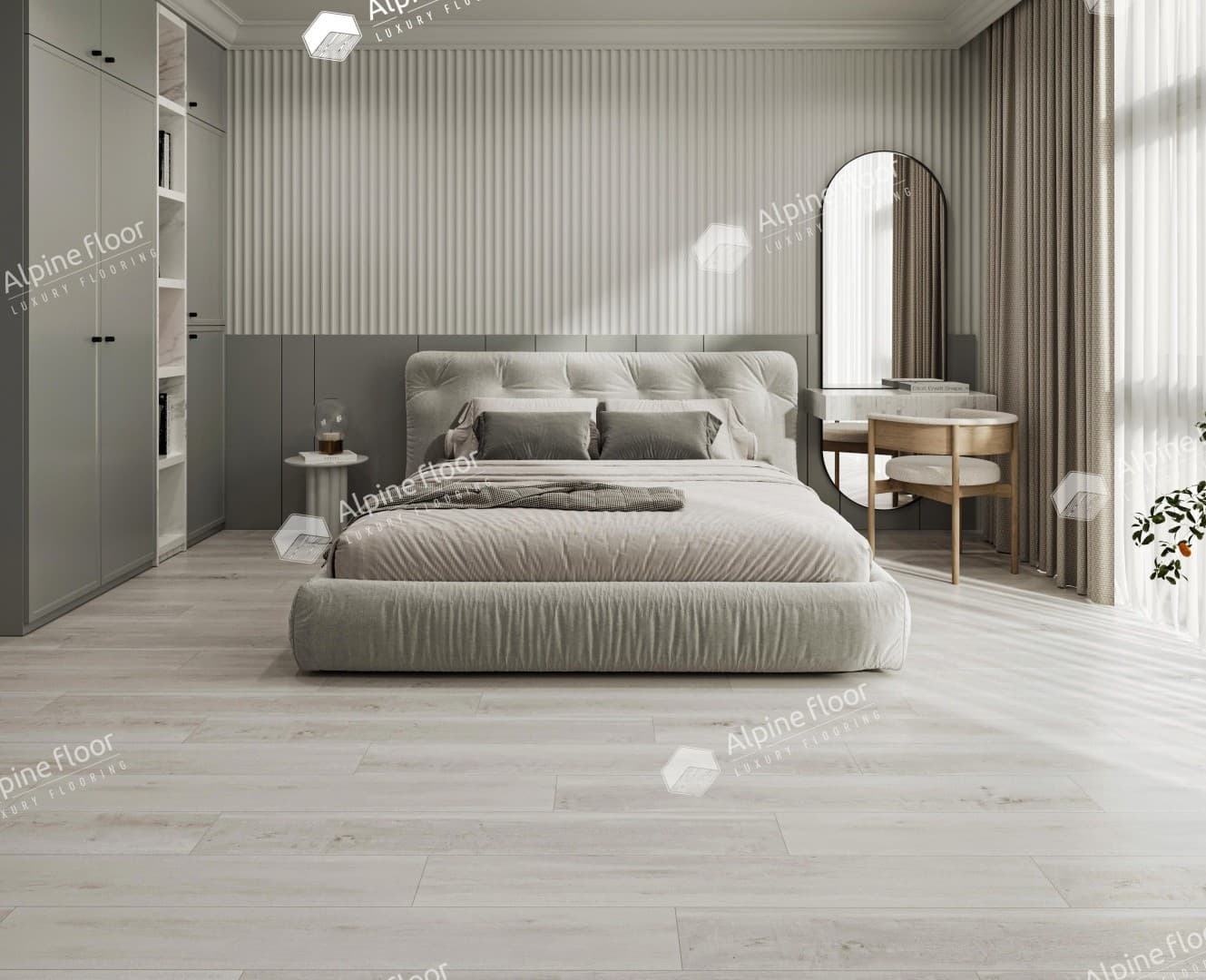 Класс экологически безопасных напольных покрытий не ограничивается натуральным камнем, деревом и керамогранитом. В этом списке есть место и для кварцвинила. Именно из него сделана модель «Дуб выбеленный».